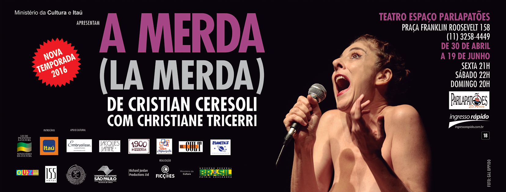 La Merda by Cristian Ceresoli was produced for the first time on stage, starring Silvia Gallerano, by Frida Kahlo Productions, Richard Jordan Productions and Produzioni Fuorivia in association with Summerhall. The production subsequently toured extensively throughout the world, including seasons at Soho Theater (London), Maxim Gorki Theater (Berlin), Adelaide Festival (Adelaide) and Fall Festival (Madrid).